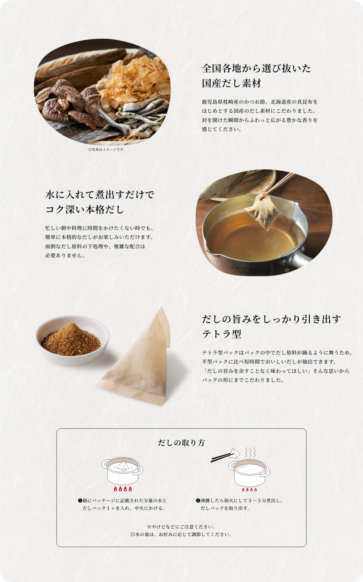 おいしさと手軽さを両立した味付きだしパック。