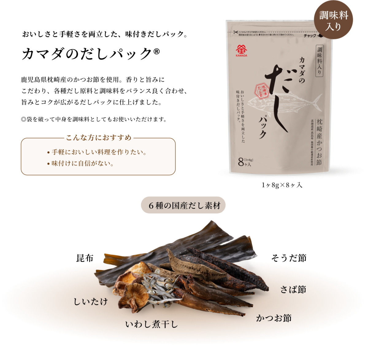 かつお節をはじめ、6種の国産だし素材と調味料をバランスよく合わせた味付きだしパック。これ一つでおいしいだしが簡単に取れます。
